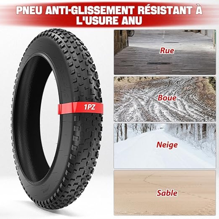 - ▶️ Large application : 1PZ pneu de vélo 20 x 4.0 est un pneu de vélo unique conçu pour le trail. Excellente résistance à la perforation pour le remplacement des pneus de vélo, de vélo électrique, de neige et de VTT.