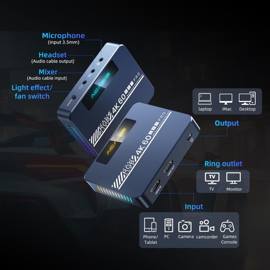 ACASIS Carte de capture vidéo HDMI avec ventilateur de refroidissement amélioré, prise en charge VRR, enregistrement 4K60 véritable pour les jeux, appareil de capture vidéo pour Xbox Series X/S.