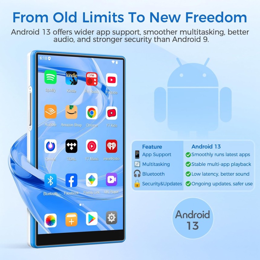 - ▶️ Expérience fluide type smartphone : Android 13 + Octa-Core : lancement d'apps rapide, navigation fluide, parfait comme lecteur mp3 bluetooth moderne. Résout les lenteurs des anciens lecteurs : musique, pochettes et paroles s'affichent avec fluidité, sans notifications. Idéal pour ceux qui veulent la simplicité d'un mini-smartphone, mais uniquement dédiée à la musique.