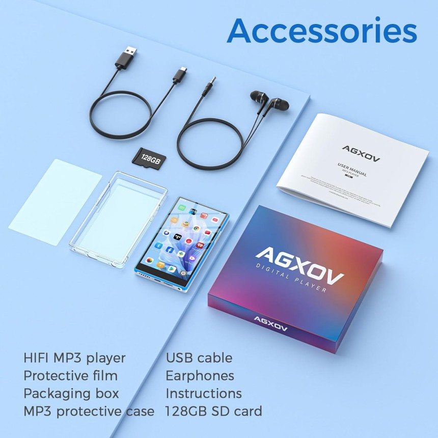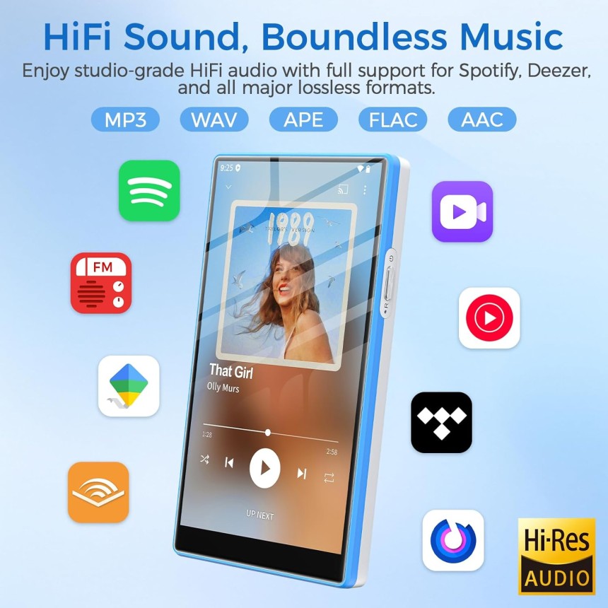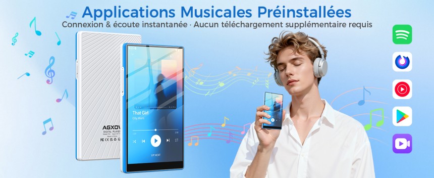 - ▶️ Bluetooth 5.0 + Wi-Fi bi-bande rapide : Wi-Fi 2,4G/5G + Bluetooth 5.0 assurent mises à jour rapides et connexions stables. Parfait comme mp3 bluetooth pour casque/enceinte/voiture. Synchronise playlists Spotify et Deezer – idéal pour les utilisateurs cherchant un lecteur mp3 Deezer ou Spotify capable d'écoute sans coupure.