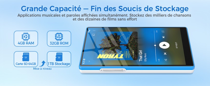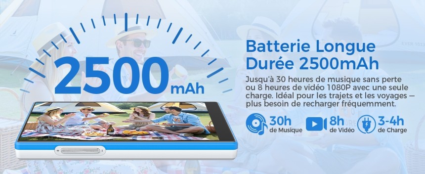 - ▶️ Batterie 2500mAh longue durée : Batterie 2500mAh : bien plus d'autonomie qu'un lecteur classique. Résout le problème de recharge quotidienne – parfait pour voyages, trajets, journées longues. Comme lecteur mp3 Android, il profite d'une meilleure efficacité avec Android 13 : plus de musique, moins de câbles, une vraie liberté d'écoute.