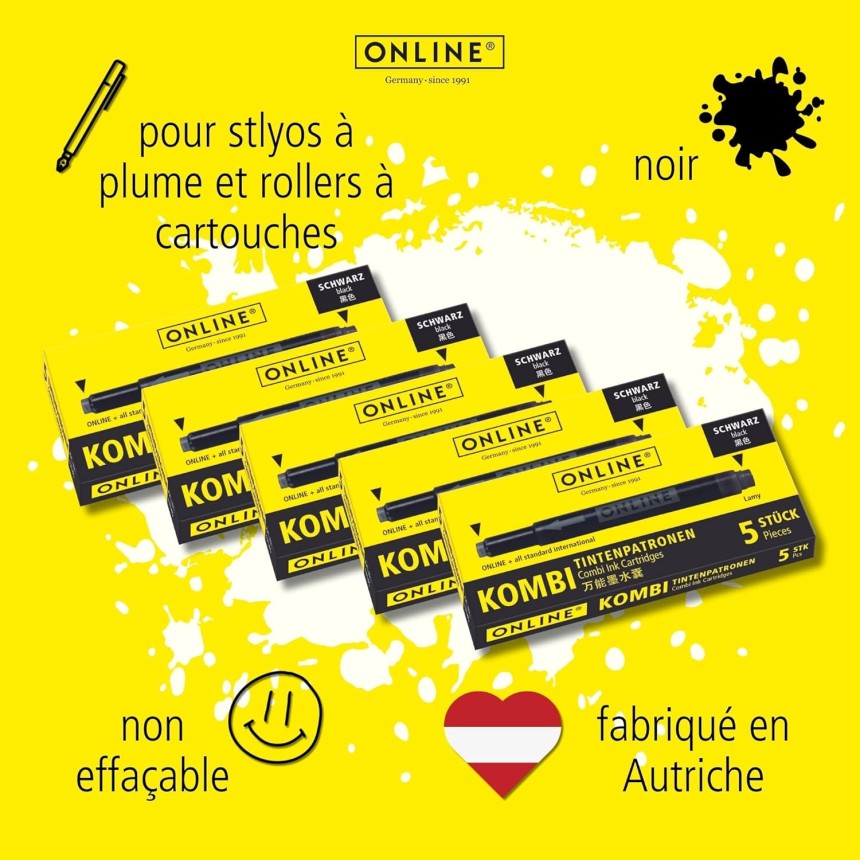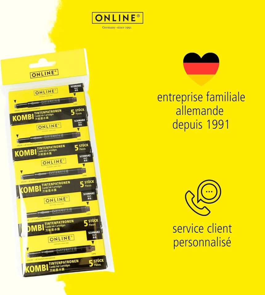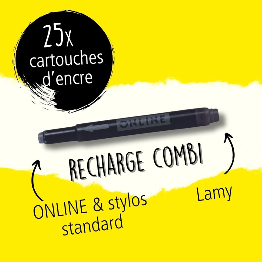 - ▶️ Cartouces d'encre combi : La cartouche à double extrémité est compatible avec tous les systèmes de stylo-plume standard ainsi qu'avec les stylos-plume Lamy. Un côté est parfait pour les stylos Lamy, l'autre côté convient à tous les autres stylos plume standard.
