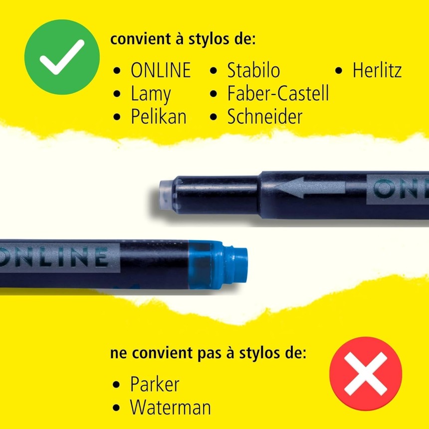 - ▶️ Celle qui est toujours compatible! Ainsi, le côté fin peut être utilisé pour ONLINE et tous les stylos plume standard et le côté large pour les stylos plume LAMY.