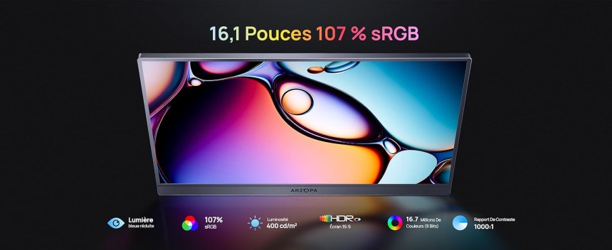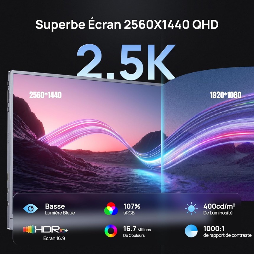 - ▶️ Qualité d’Image Exceptionnelle en 2.5K QHD: Profitez d’une qualité d’image exceptionnelle sur l’écran portable ARZOPA de 16,1". La combinaison de la résolution QHD 2560×1440, du spectre de couleurs 107 % sRGB et du HDR10 offre des détails d’une netteté extrême et des couleurs remarquablement vives. Avec 400 nits de luminosité et une fréquence de 180 Hz, chaque scène prend vie avec une fluidité parfaite.