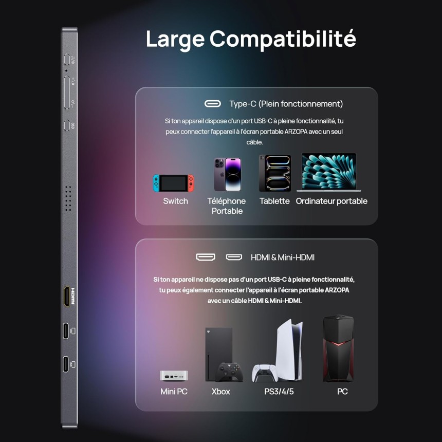 - ▶️ Compatibilité Étendue: Ce moniteur portable est compatible avec la plupart de vos appareils préférés, y compris les PC (Windows/macOS), les consoles de jeu populaires telles que PS5, Xbox Series X/S, Nintendo Switch, ainsi que les appareils portables comme le Steam Deck. Une connexion instantanée pour répondre à tous vos besoins, qu'il s'agisse de jeu, de travail ou de divertissement.