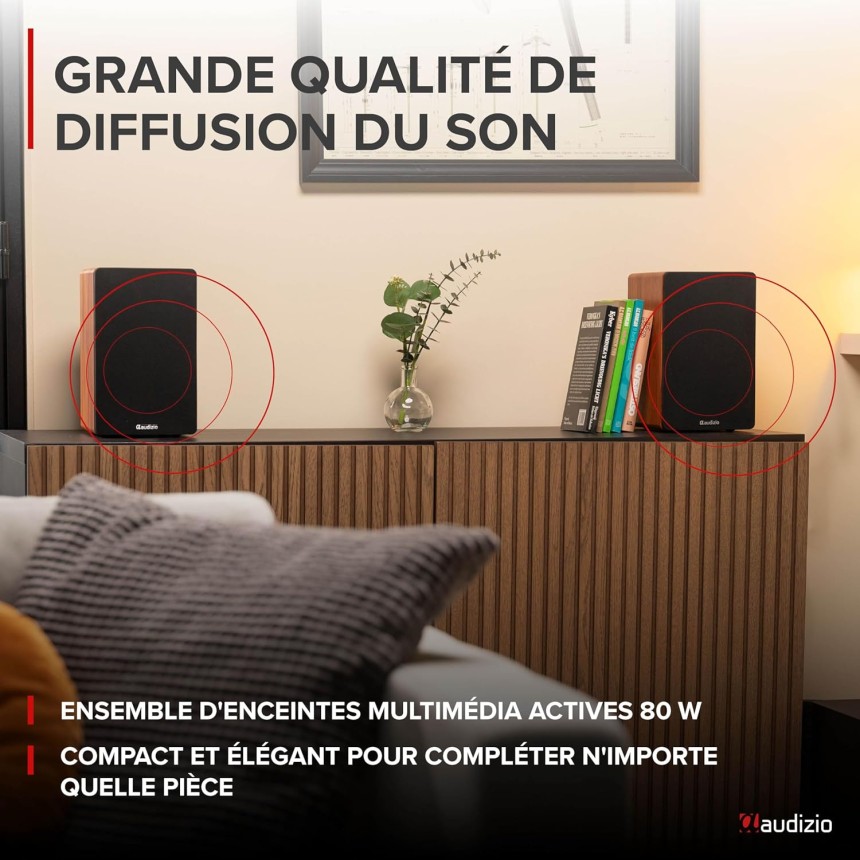 - ▶️ Enceintes Hi-Fi bibliothèque actives 2.0 de 80W avec woofer 4" et tweeter 1,25", diffusant un son clair et puissant, idéales pour musique, télévision, gaming ou toute écoute à la maison.