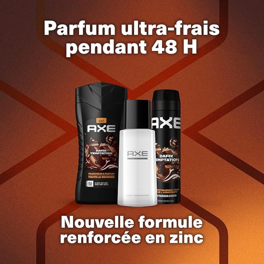 - ▶️ Reste frais et sens irrésistiblement bon avec le coffret AXE Dark Temptation. Ce coffret contient 3 produits homme pour sentir bon toute la journée : un déodorant bodyspray de 200 ml, une eau de toilette de 100 ml et un gel douche 5 en 1 de 250 ml. Un coffret au parfum masculin et frais aux notes de chocolat noir, idéal pour offrir ou se faire plaisir, parfait pour toutes les occasions. Le déodorant homme bodyspray de 200 ml apporte une protection contre les odeurs et libère un parfum ultra-frais pendant 48 h.
