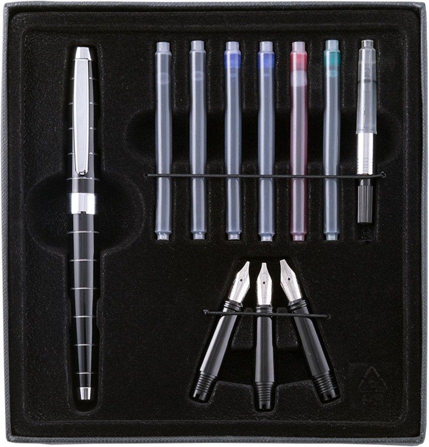 - ▶️ La clé de la calligraphie parfaite : Le stylo plume de Cretacolor : Au centre du kit se trouve l'élégant stylo-plume, fabriqué en métal noir, qui est non seulement visuellement attrayant, mais aussi ergonomique et fonctionnel. Au cœur du kit se trouvent les trois poignées de largeur différente (1,1 mm, 1,5 mm, 1,9 mm) qui offrent de nombreuses possibilités pour différents styles de police et épaisseurs de trait. Ces poignées permettent aux utilisateurs de développer et d'affiner leur écriture individuelle.