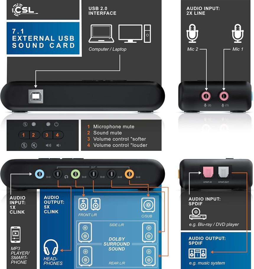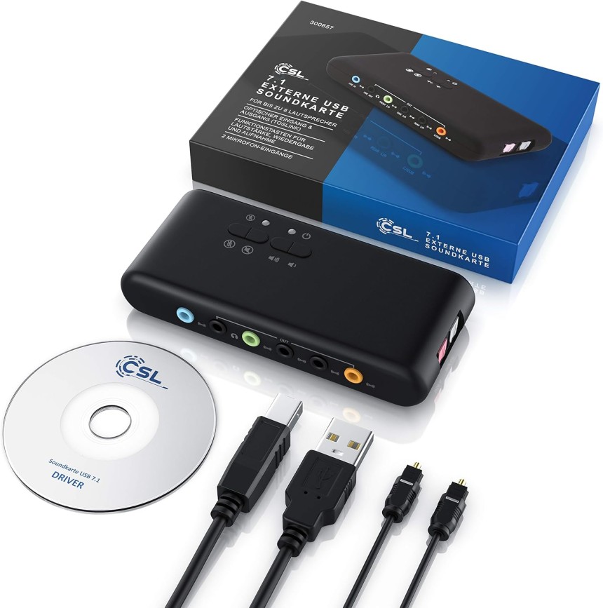- ▶️ Désignation du modèle : CSL USB 7.1 carte son externe (Channel Encoder) pour maximum 8 haut-parleurs
