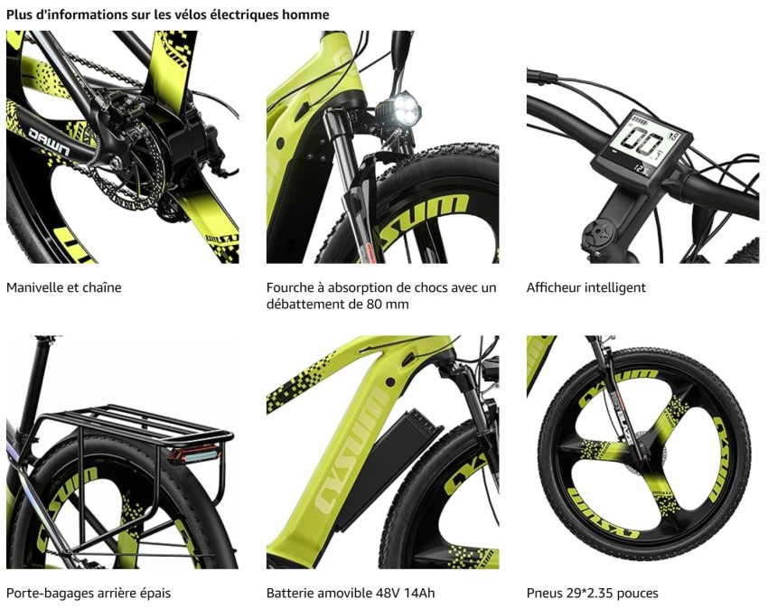 - ▶️ Moteur sans balais : le 29 pouces VTT électrique est équipé d'un moteur de 80Nm, qui fournit une puissance élevée et est associé à un volant d'inertie à 7 vitesses pour faciliter l'escalade.