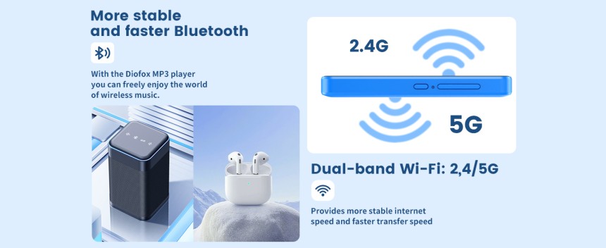 - ▶️ WiFi et Bluetooth : connectez-vous au WiFi pour une utilisation en ligne et personnalisez votre lecteur MP3. Appairez-le avec des appareils Bluetooth comme des écouteurs et des enceintes, offrant une grande stabilité, une large compatibilité et une excellente expérience utilisateur.