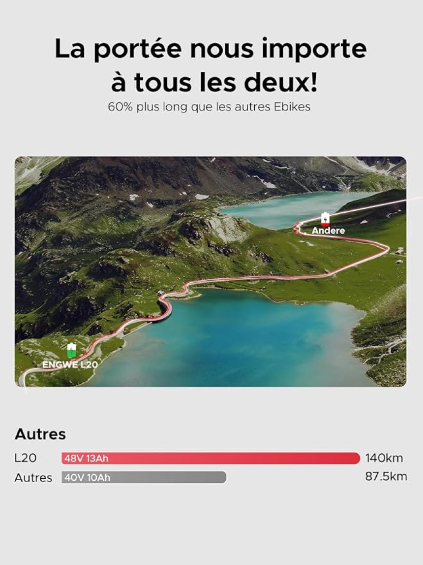 ▶️ Le ENGWE L20 est un vélo électrique qui respecte pleinement le code de la route européenne. La puissante batterie 48V 13Ah et le moteur sans balais de 250W de l'Ebike permettent d'atteindre des vitesses allant jusqu'à 25 km/h. L'autonomie du booster peut aller jusqu'à 126 km. Le vélo électrique ENGWE L20 n'a pas de levier d'accélération. Si vous avez besoin d'accélérer, il vous suffit d'appuyer sur le bouton pour accélérer.