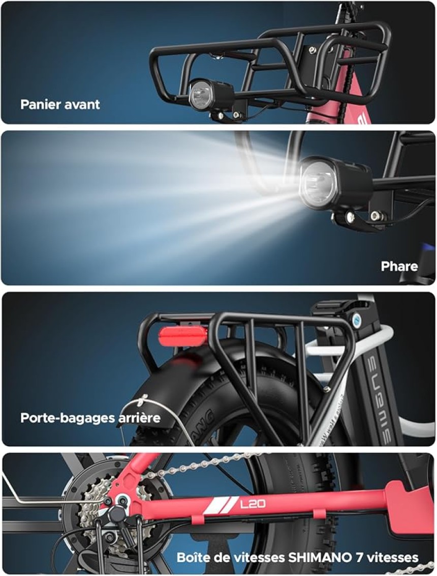 ▶️ Pneus et suspensions améliorés : Acquérir sans effort tous les terrains grâce aux incroyables pneus 20*4 pouces de l'E Bike L20. L'excellente fourche avant et la suspension de la tige de selle offrent un confort incomparable et assurent une conduite sans faille, même sur les routes cahoteuses.