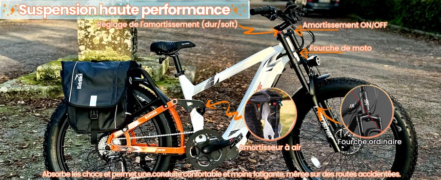 - ▶️ Suspension à air & pneus Fat 4 pouces : Le Ranger & Trax est doté d’une fourche avant de style moto avec amortisseurs réglables. Associé à un amortisseur arrière à air, il améliore considérablement le confort et la stabilité de conduite.Équipé de pneus larges de 4 pouces de haute qualité, ce vélo à pneus larges de trail excelle sur les sentiers, dans les terrains difficiles, et peut affronter la neige, les montagnes, les plages et la boue.