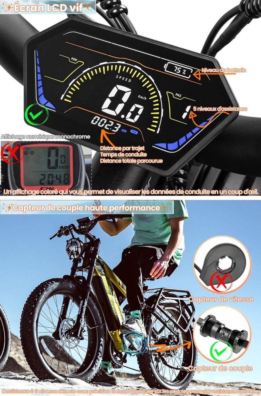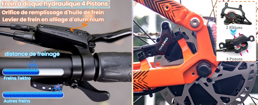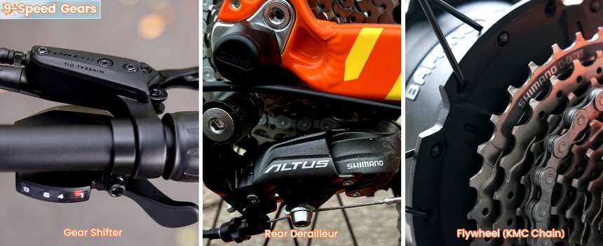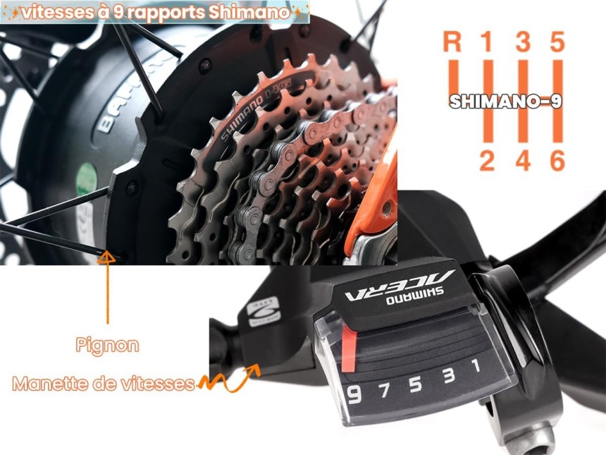 - ▶️ Système de freinage hydraulique & Shi..mano 9 vitesses : Ce vélo électrique tout-terrain de Suspension intégrale est équipé de leviers de frein antidérapants avec coupure moteur, de freins à disque hydrauliques puissants et d’un système de vitesses Shi.mano à 9 rapports. L’ensemble assure un contrôle précis et un freinage fiable, même sous la pluie ou la neige — pour une sécurité optimale à chaque trajet.