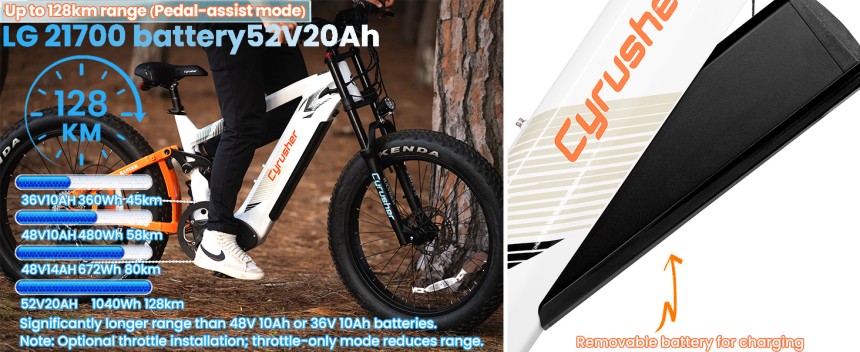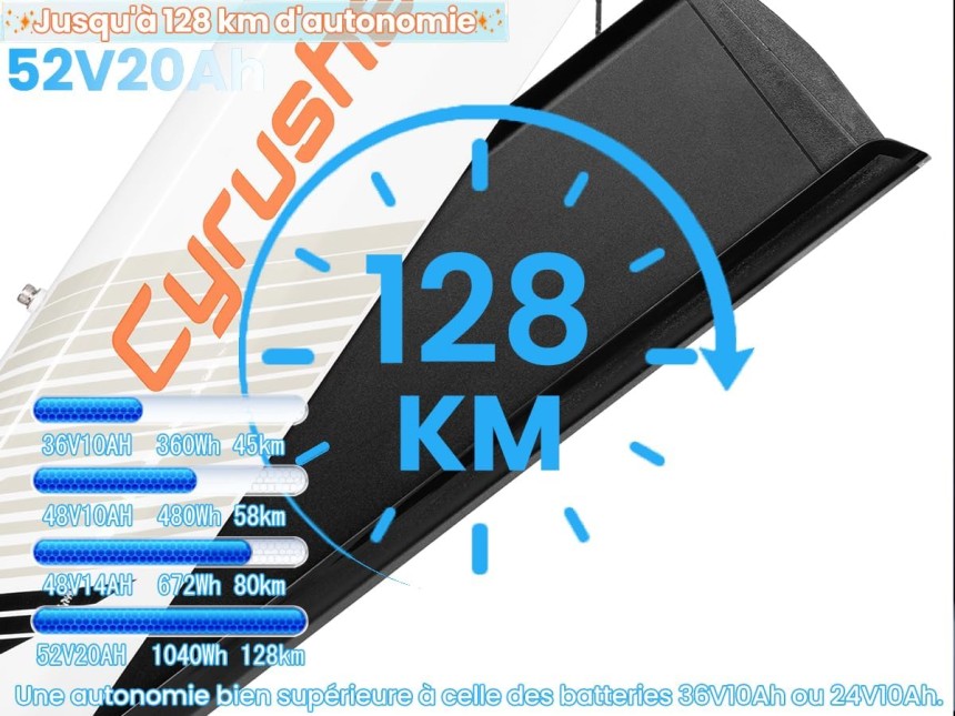 - ▶️ Batterie L.G 128km (avec assistance), moins en mode accélérateur & Étanchéité IPX5 : Le Ranger & Trax, vélo électrique tout-terrain, est équipé d’une batterie lithium L.G amovible de 52V 20Ah et d’un design étanche IPX5. La batterie L.G se retire facilement pour un rechargement pratique au bureau ou ailleurs, éliminant toute inquiétude d’autonomie. En mode assistance, une charge complète offre jusqu’à 128km, idéal pour les longues distances.