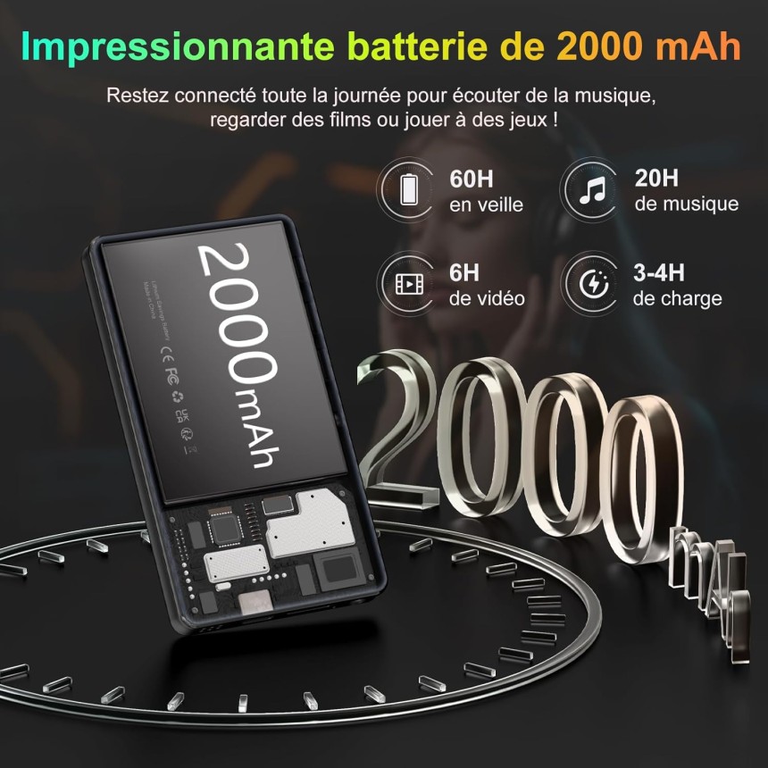 - ▶️ Durée de vie moyenne de la batterie : 4h de charge à 2000mAh + 20h de Musique ou 6h de vidéo avec écouteurs filaires à 50% de volume