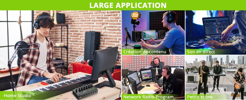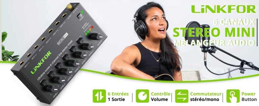 - ▶️ Ultra Faible Bruit : Le mini table de mixage 6 voies offre d'excellentes performances audio avec une meilleure qualité sonore même au niveau de sortie maximal. Avec une alimentation certifiée 5V, le cordon d'alimentation est équipé d'un anneau magnétique pour minimiser les interférences sonores externes.