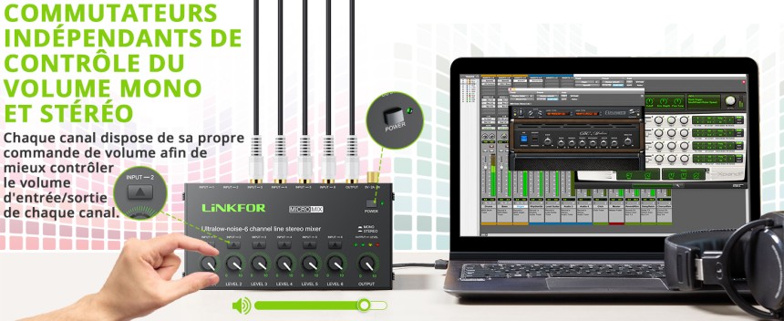 - ▶️ Switch Stereo / Mono, Contrôle du Volume Indépendant : Chaque canal d'entrée et canal de sortie a une fonction de réglage du volume, qui peut facilement ajuster le son de chaque canal pour obtenir le meilleur effet. Le produit prend en charge la commutation entre les canaux mono et doubles, et chaque canal peut être réglé sur les canaux mono ou doubles avec une touche.