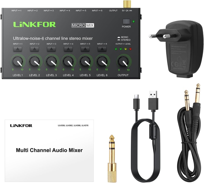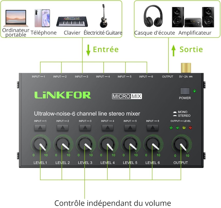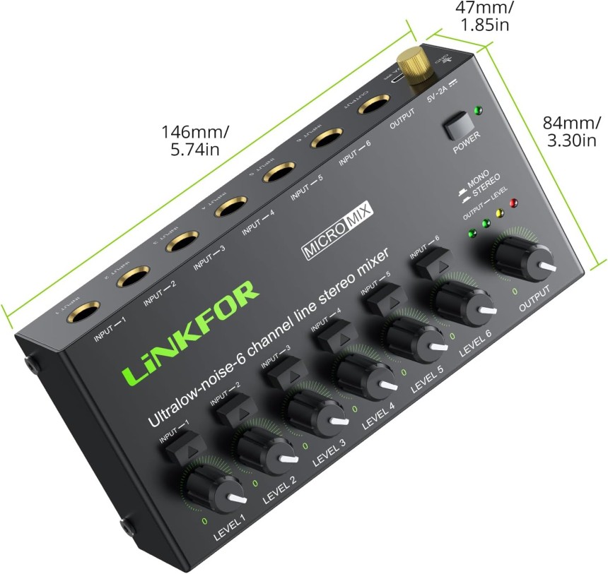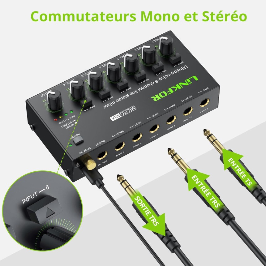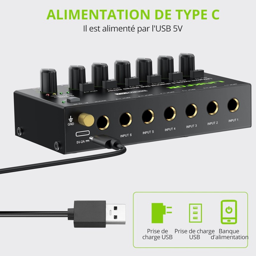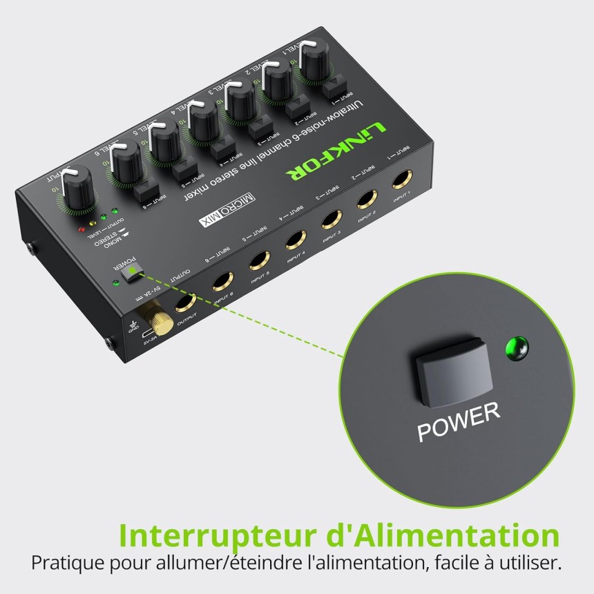Mini Mélangeur Audio Stéréo 6 Canaux Mélangeur de Ligne Ultra-Faible Bruit Switch Stereo/Mono, Contrôle du Volume Indépendant pour Mixage, Melangeur Audio Jack DC 5V Type-C pour Club Bar.