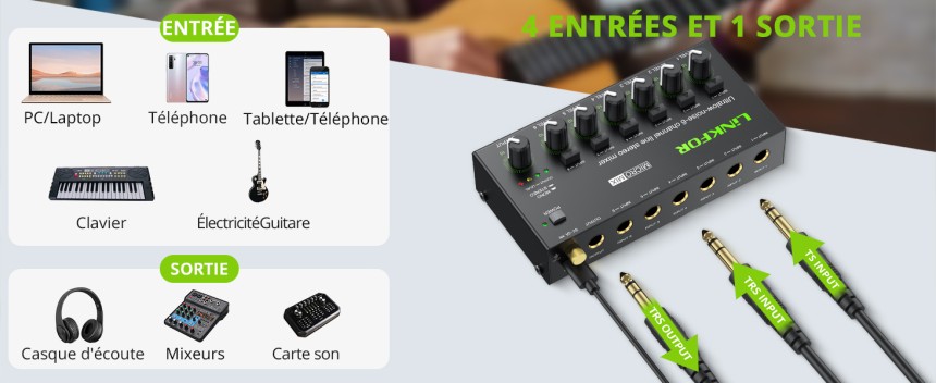 - ▶️ 6 Canaux Mélangeur Audio Multifonctionnel : Mélangeur audio ultra-compact à 6 canaux pouvant mélanger rapidement et facilement des signaux à 4 fils, collecter le son de plusieurs sources sonores en une seule sortie pour connecter des écouteurs et des haut-parleurs pour l'écoute. Idéal pour les petits micros de club ou de bar, les guitares, les basses, les claviers, les téléphones portables et les mélangeurs de scène.