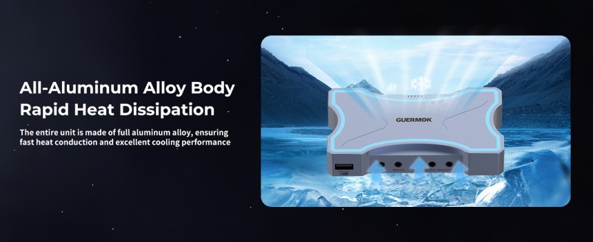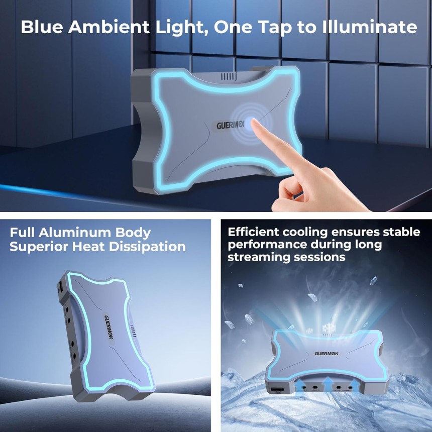 - ▶️ Boîtier en aluminium avec refroidissement passif, sans surchauffe : Construit en aluminium durable pour une dissipation thermique efficace sans ventilateur. L’appareil reste stable et frais même lors de longues sessions. Dispose d’un bouton tactile avec éclairage ambiant bleu doux pour une utilisation intuitive et élégante