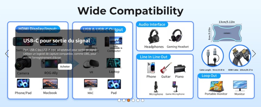 - ▶️ Sortie audio quadruple pour monitoring et partage : Offre quatre options de sortie audio simultanées : audio du périphérique de capture, passthrough HDMI, Audio Out et Speaker Out. Connectez facilement à la fois un casque et des enceintes pour un monitoring flexible ou une diffusion collective pendant le streaming ou l’enregistrement