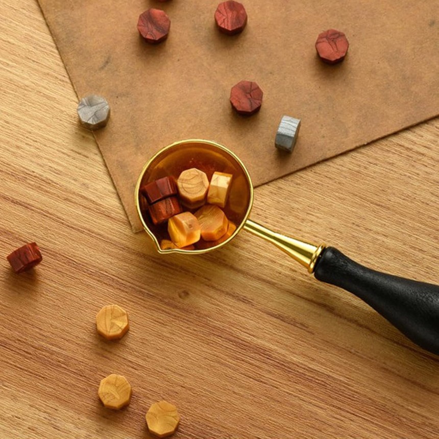- 2. Versez la cire fondue sur l'enveloppe, la lettre, la carte ou tout autre endroit que vous souhaitez sceller. 3. Appuyez sur le tampon de cire sur la cire fondue, attendez quelques secondes que la cire refroidisse, puis retirez le tampon. Conseils: La cuillère à cacheter en cire en métal peut simplement être essuyée avec une serviette pendant qu'elle devient noire à cause de la chaleur.