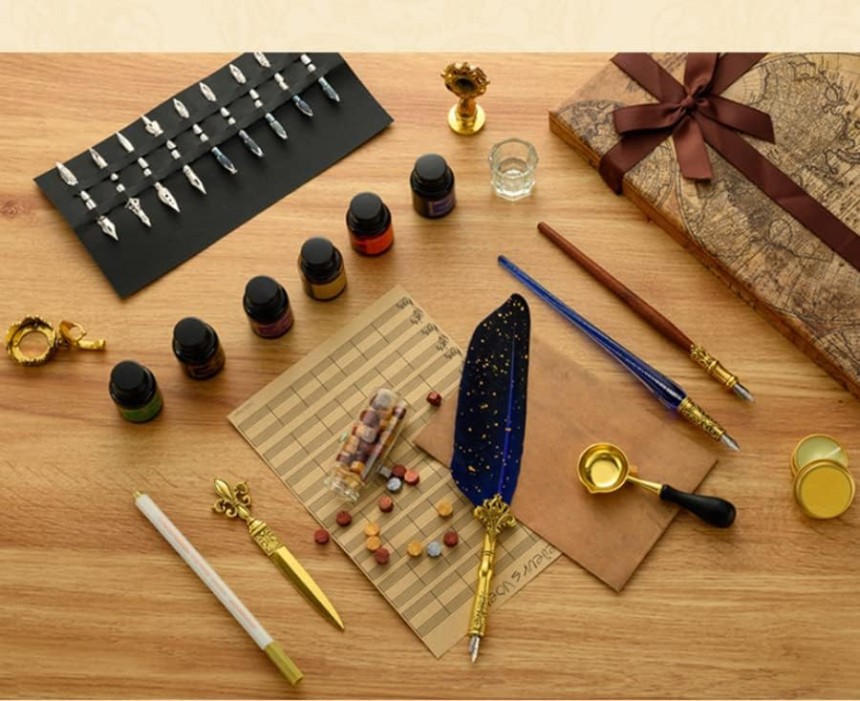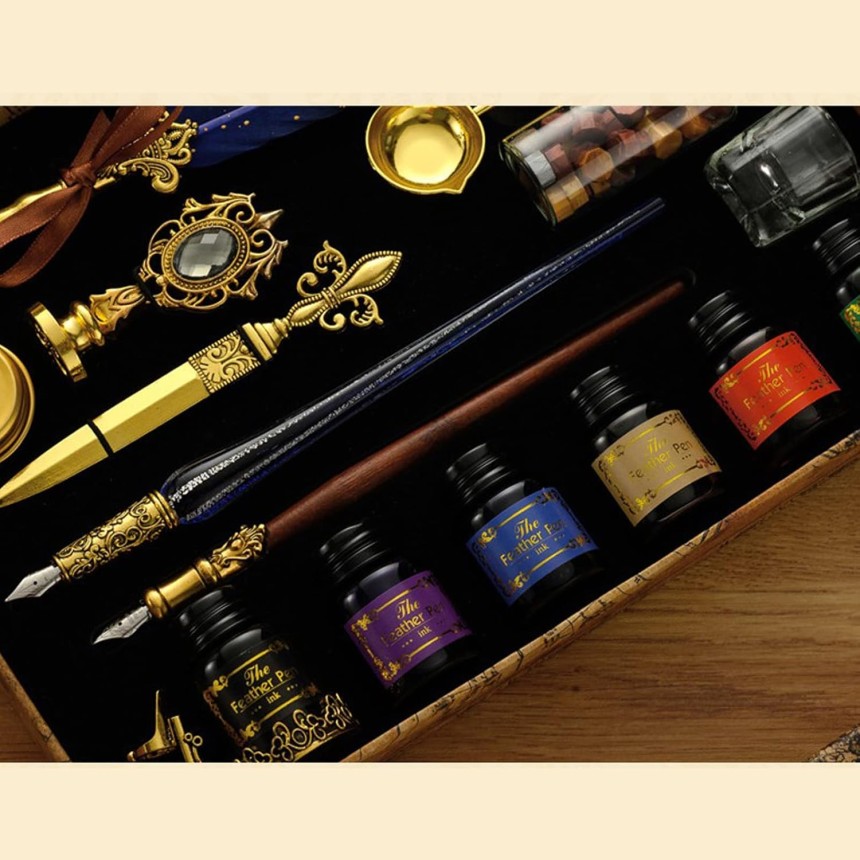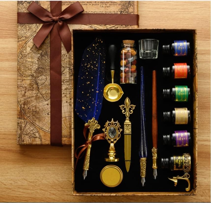 - ▶️ Ensemble de calligraphie comprend : 1 stylo plongeur, 1 stylo plongeur en verre, 1 stylo plongeur en bois, 18 plumes de rechange, 6 flacons encre de 10 ml, 1 flacon de perles de sceau de cire, 1 tampon à sceau, 1 bougie, 1 porte-stylo, 1 cuillère, 1 gobelet de nettoyage pour stylo, 1 ouvre-enveloppe, 1 boîte cadeau.