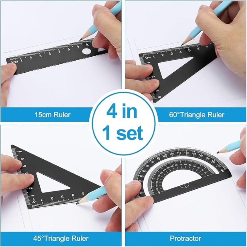 - ▶️ Contenu de l'emballage : ensemble de 4 pièces, comprenant 1 règle, 2 triangles, 1 rapporteur, une boîte transparente robuste et réutilisable pour un rangement et un transport faciles, vous permettant de stocker et de transporter l'ensemble en toute sécurité et proprement.