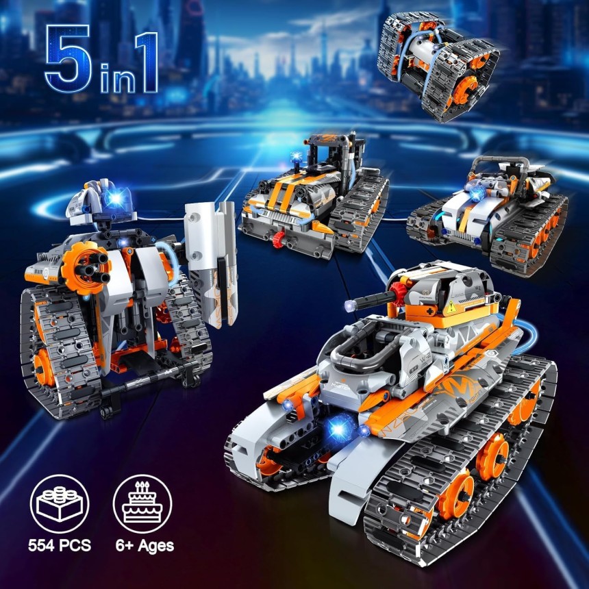 - ▶️ Kit de construction RC 5 en 1 : Cet ensemble de construction de cascades télécommandées comprend 554 blocs de construction et peut être assemblé en 5 modèles : voiture à chenilles télécommandée/robot télécommandé/char de course télécommandé, etc. Les jouets de construction de robots Technic ont des lumières LED cool, une tête et des bras rotatifs flexibles. Le design cool et intéressant permet à chaque enfant de s'amuser.