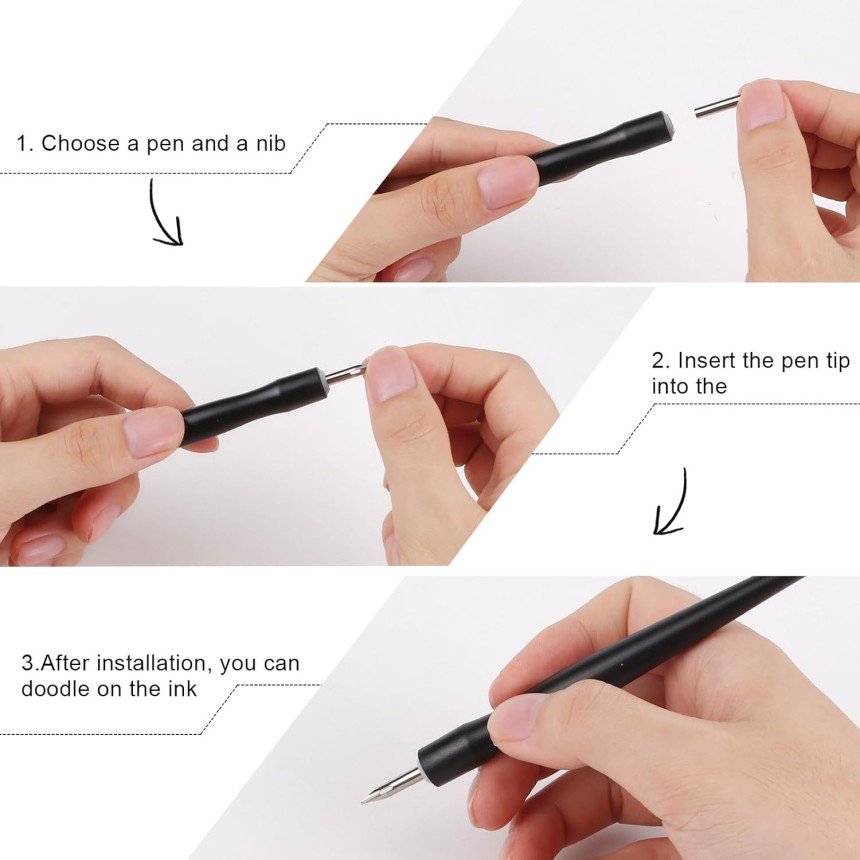 - ▶️ Avant utilisation, insérez la pointe dans l'insert métallique du corps du stylo, trempez dans l'encre et utilisez. Lorsque vous remplacez la pointe, retirez la pointe et insérez une pointe de rechange.