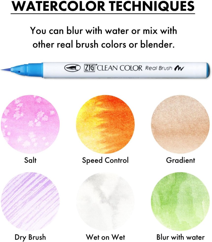 - ▶️ 24 COLORS SET : ZIG Clean Color Real Brush is a brush type watercolor pen, so it can be used in a wide range of applications such as illustration, design, lettering, and Manga. Because it is a water-based dye ink, you can blur it with water or mix with other real brush colors or blender. The pens are not individually shrink wrapped.