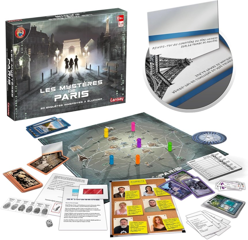 - ▶️ Des choses étranges se produisent dans la ville de Paris : des crimes, des vols, et même des meurtres… Aide la police à retrouver les criminels en te rendant dans plusieurs monuments emblématiques de Paris et en décryptant des indices codés ! Trouve des informations sur les tombeaux du Cimetière du Père Lachaise, sur les plaques commémoratives des Catacombes, ou encore dans des kiosques parisiens... Qui sera le premier à démasquer le coupable ? Jeu de plateau. De 2 à 6 joueurs.