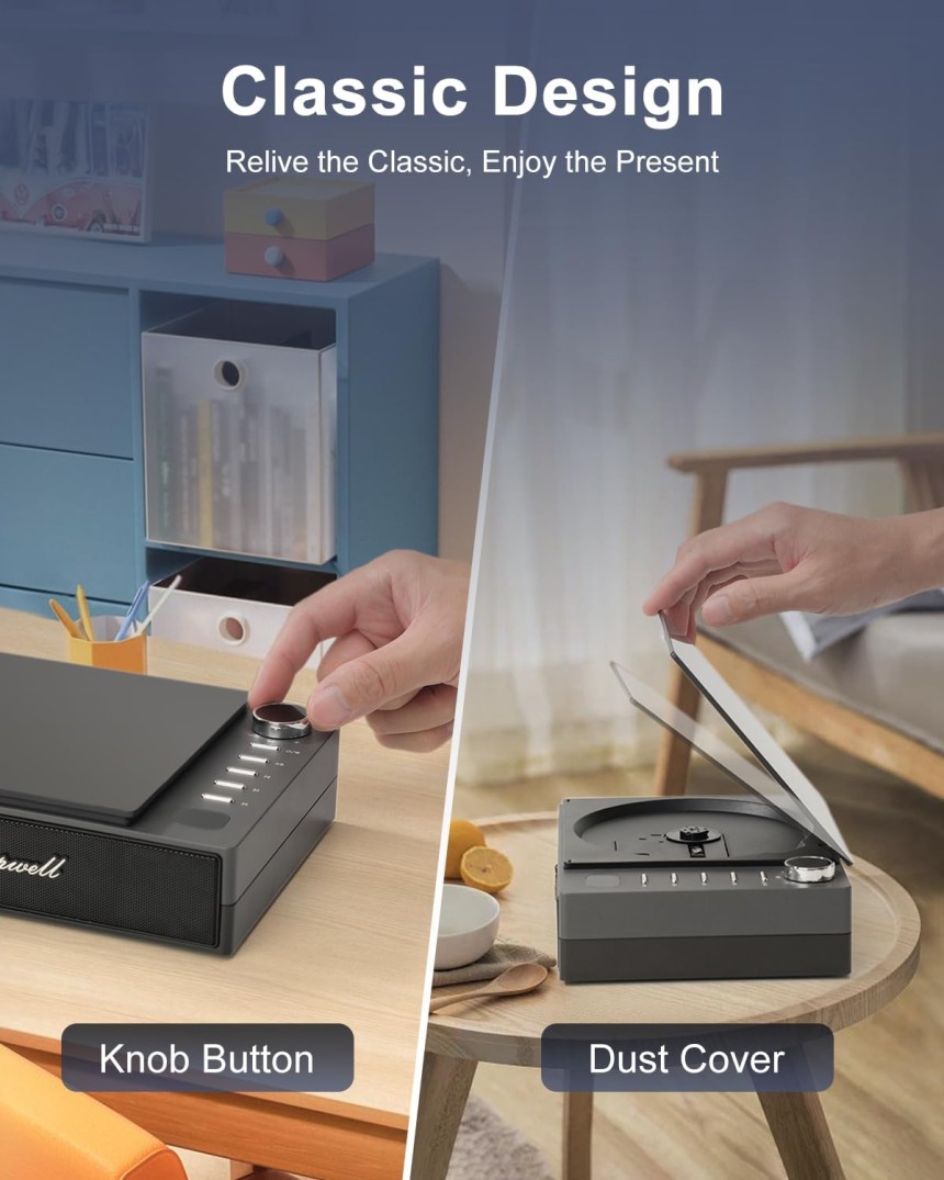 - ▶️ Petit tourne-disque à l'ancienne Rétro avec capot ouvert/fermé comme le vinyle.