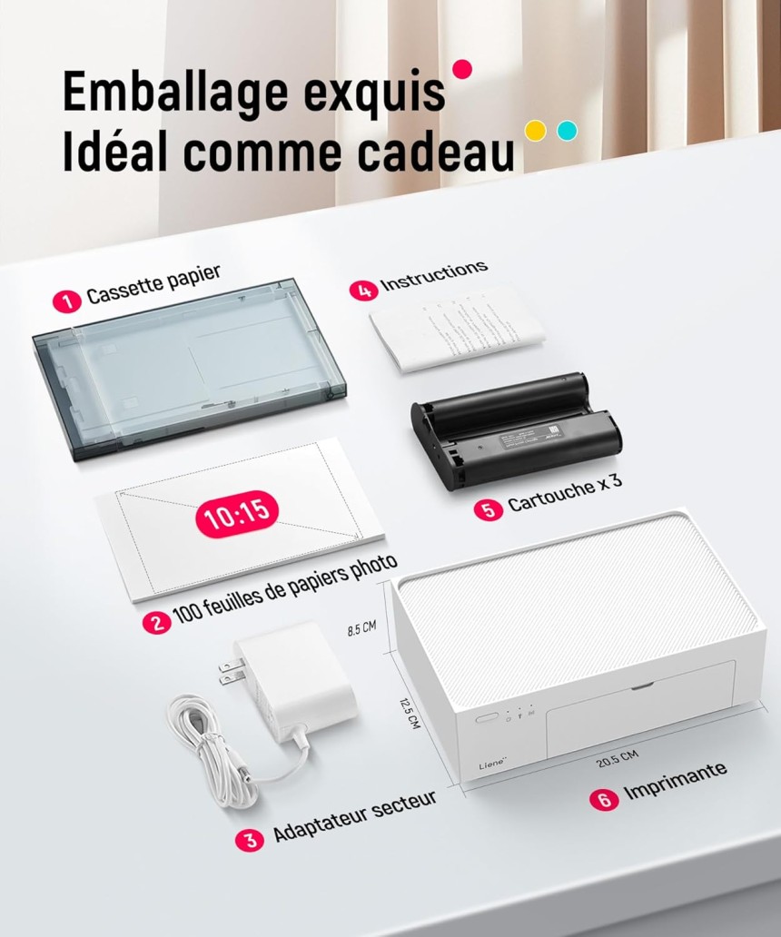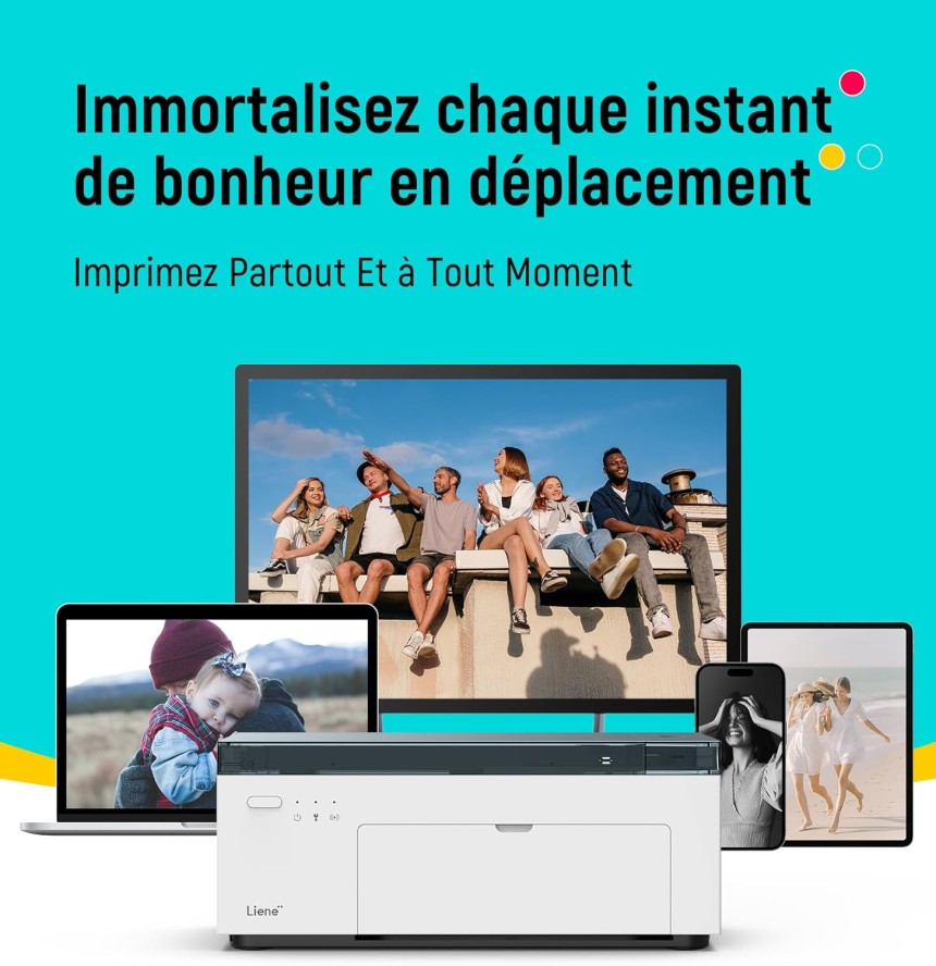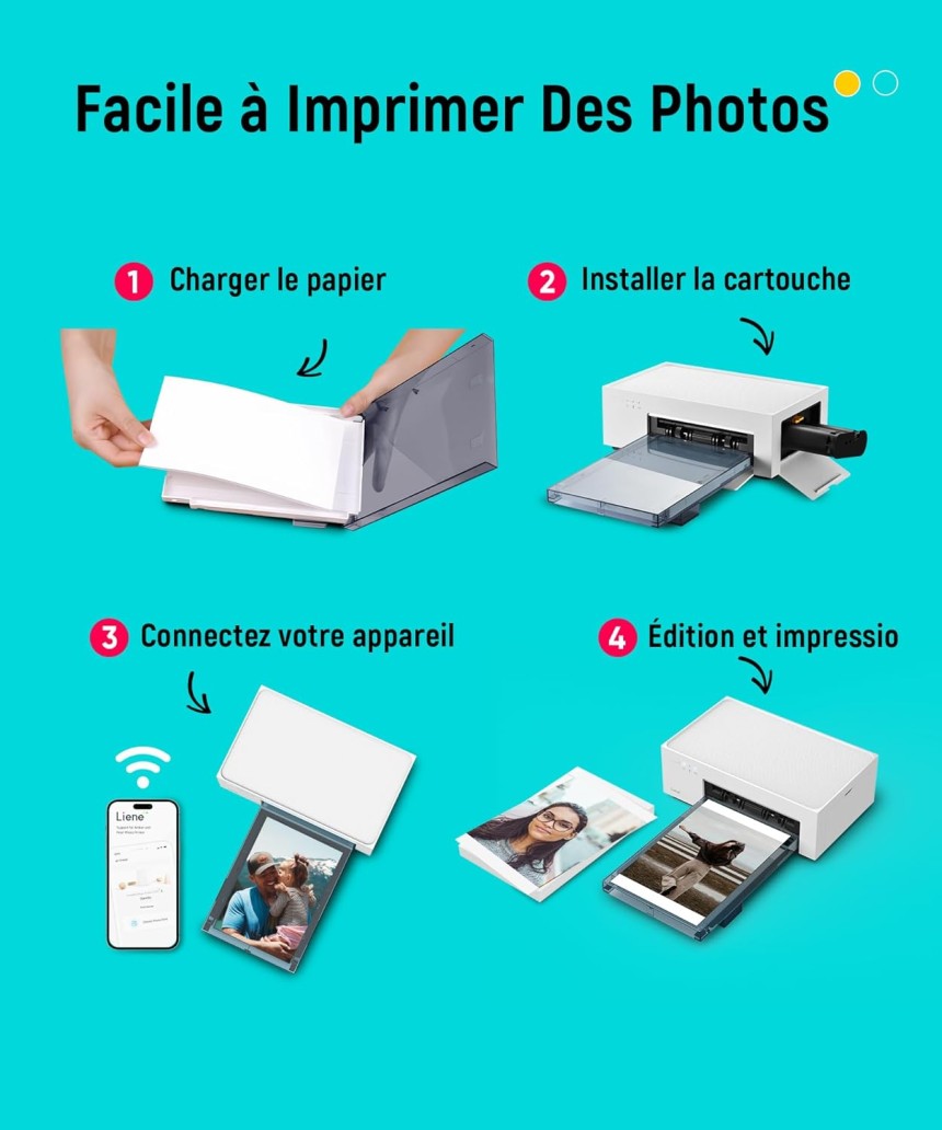 - ▶️ 100 Feuilles Papiers 10x15cm & 3 Cartouche : Liene imprimante photo wifi instantané est livré avec lot de 100 papiers photo spécialement pour sublimation thermique et 3 cartouche d'encre. Papiers Photo 10x15cm - 4x6'' format carte postale, est un format idéal pour imprimer vos plus beaux souvenirs.