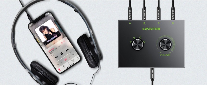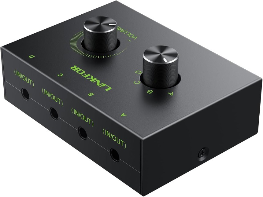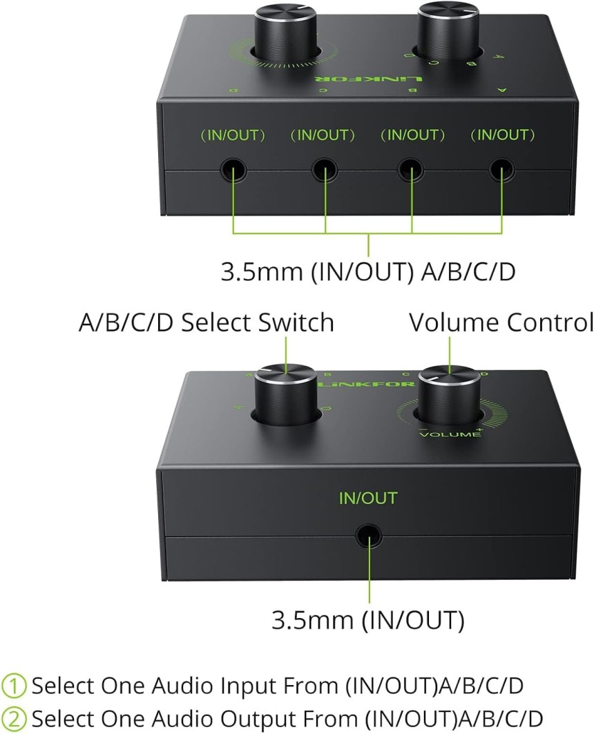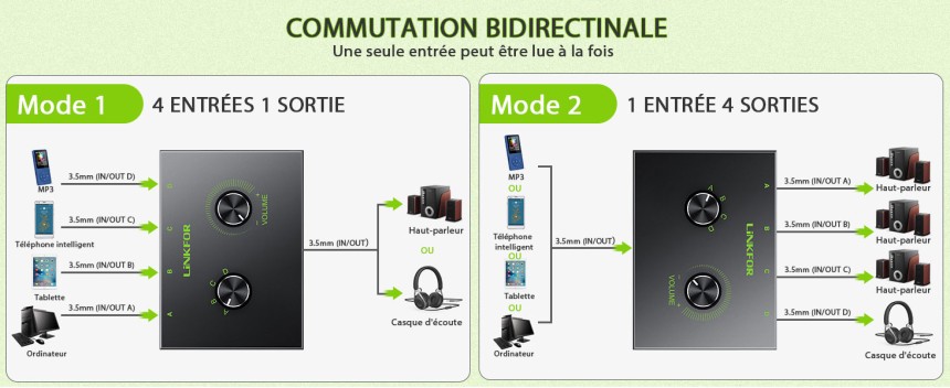 LiNKFOR 4 Ports Commutateur Audio Stéréo 3.5mm - Support 1 in 4 Out ou 4 in 1 Out avec 3.5mm Audio Câble - Sélecteur Audio Stéréo 4 Ports 3,5 m Audio pour PC Téléphone Portable Haut-Parleur Passif.