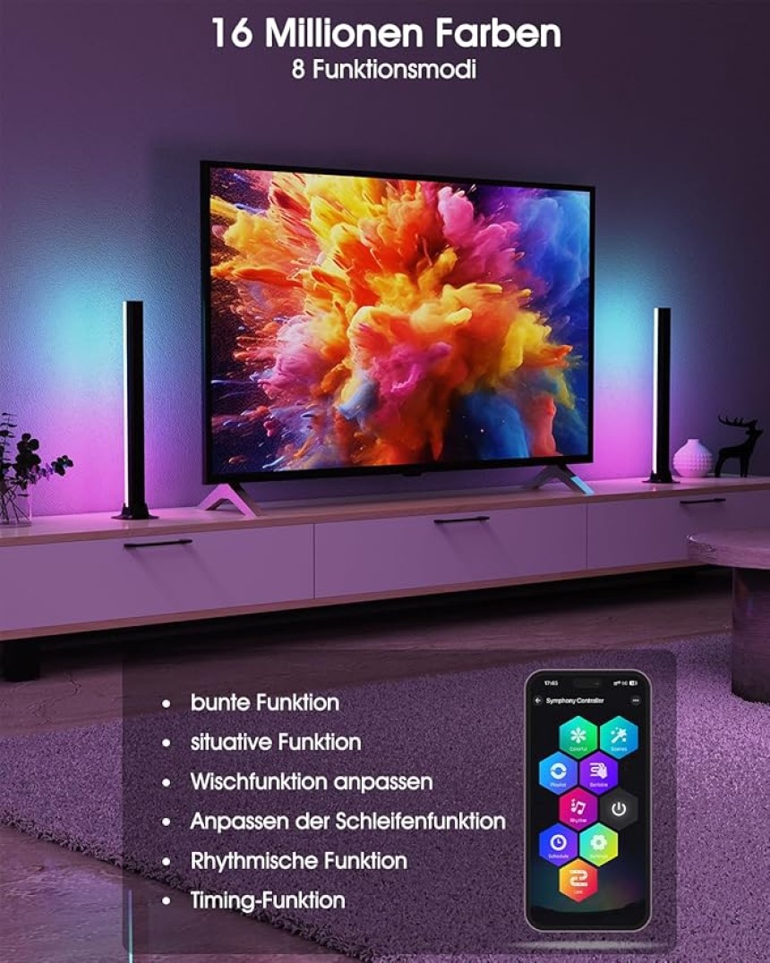 - ▶️ Fonction de rythme et de synchronisation : Options de 3 modes de rythme intégrées : mode musique, microphone de téléphone portable. Microphone de l'appareil (selon la configuration de l'appareil). La bande lumineuse changera avec le rythme de la musique, ou le microphone capturera le son externe