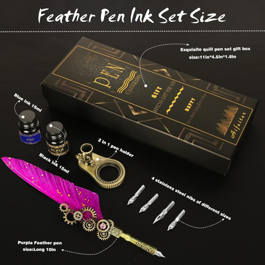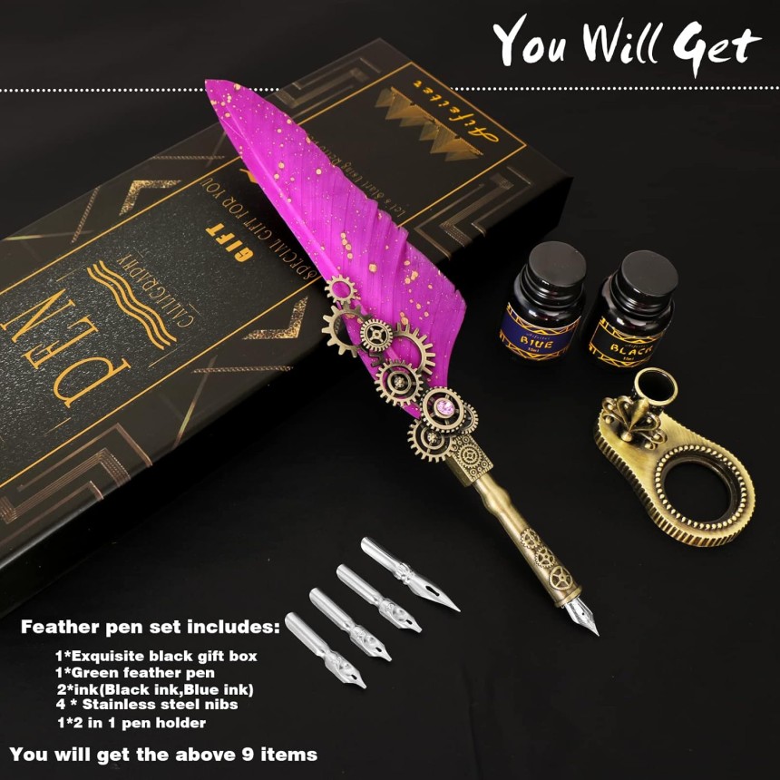 - ▶️ Détails exquis en plume : chaque plume est fabriquée à partir de plumes naturelles, teintées et dégraissées pour conserver un éclat soyeux permanent. Le barillet et la pointe sont en métal durable pour un nettoyage facile et une utilisation durable, et sont livrés avec une encre non toxique facile à utiliser. Utilisez-le pour pratiquer votre vocabulaire, écrire des lettres, des cartes de vœux, des documents et plus encore!