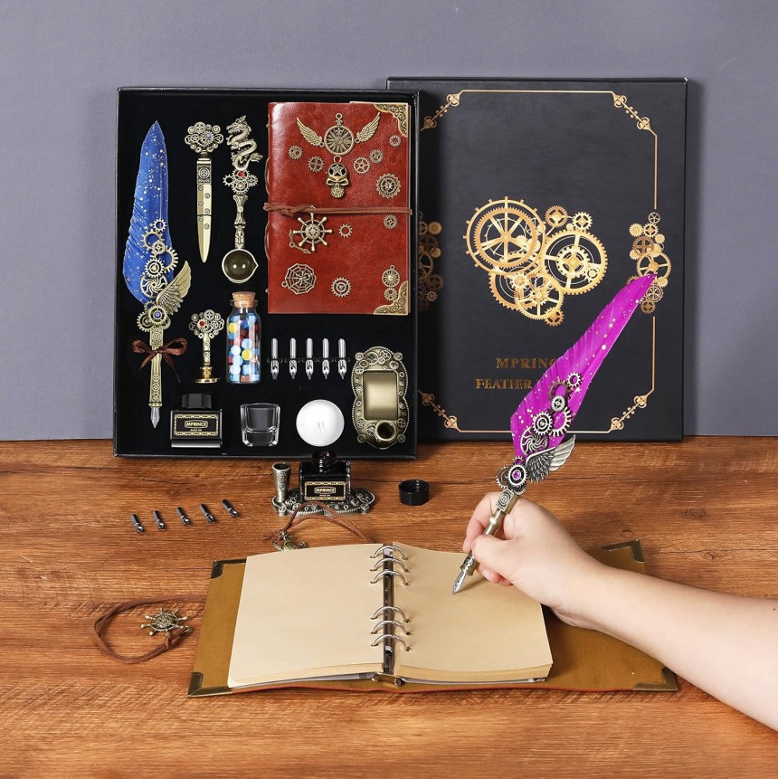 - ▶️ Le kit d'encre Quill Pen comprend : 1 stylo de calligraphie à plumes, 1 carnet, 1 encre (noir), 5 pointes de stylo en acier inoxydable de différentes tailles, 1 2 dans un porte-stylo sculpté (peut contenir une plume et de l'encre), 1 perle de cire de couleur, 1 bougie blanche, 1 tampon « horloge à engrenage », 1 cuillère à cire à fondre, 1 enveloppe, 1 papier à lettre, 1 tasse (tasse Vous pouvez utiliser le ressort avec Nettoyer à l'eau ou verser l'encre dans l'encre Dip pour écrire), 1 outil d'enveloppe ouverte, 1 coffret cadeau exquis