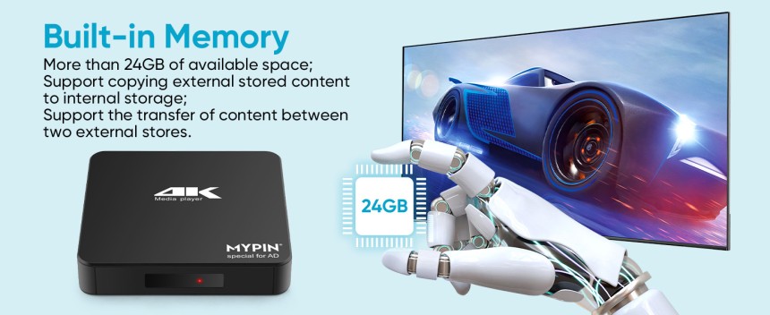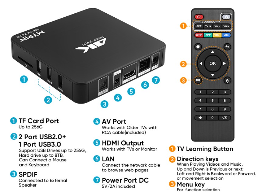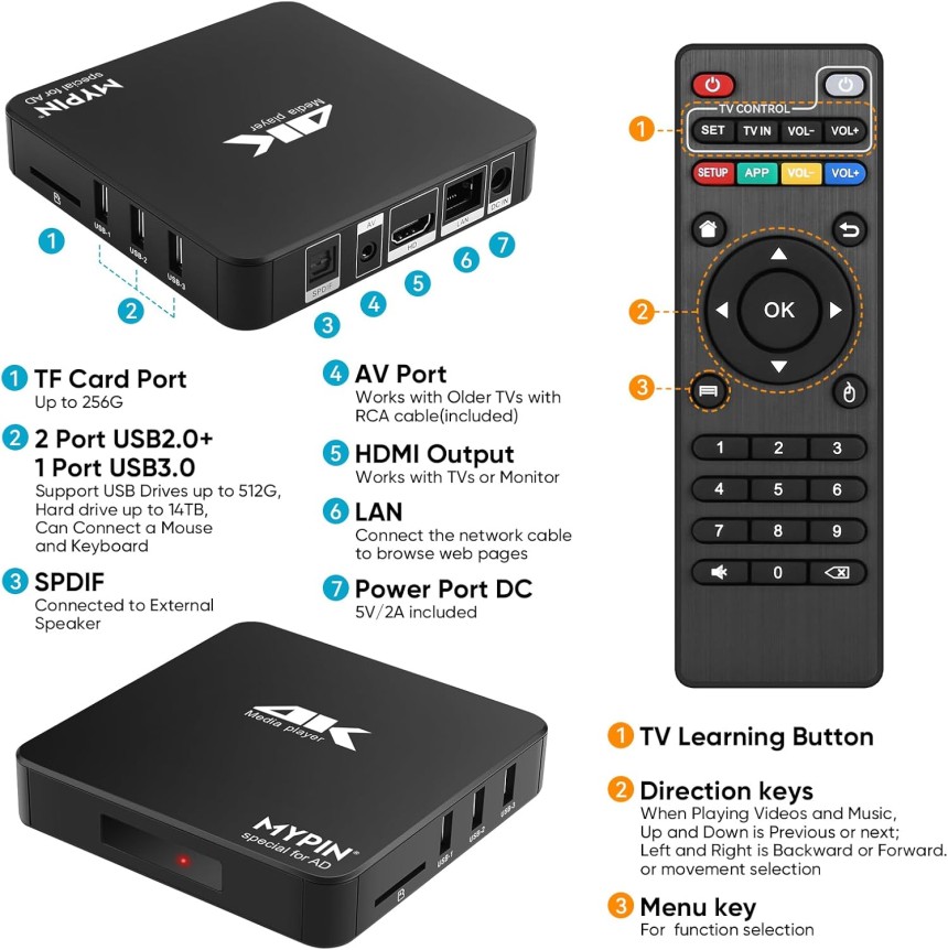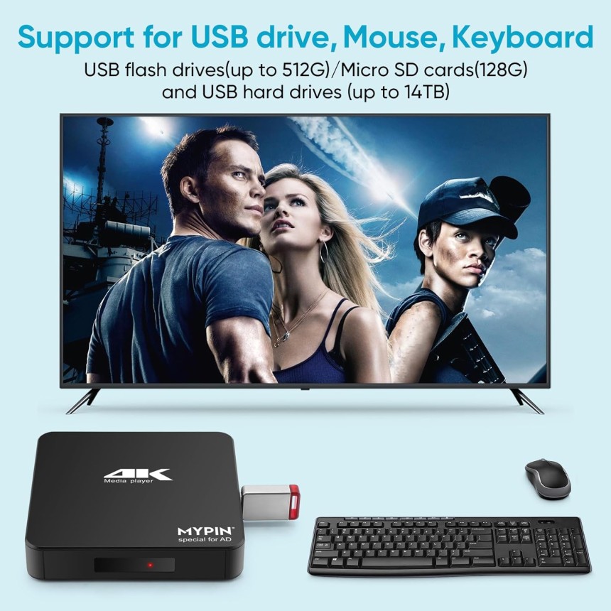 - ▶️ Compatibilité puissante : media player 4k peut lire à partir d'une carte micro SD, d'un lecteur flash USB jusqu'à 256 Go et d'un disque dur jusqu'à 8 To; y compris FAT32, exFAT et NTFS.; L'appareil dispose d'une mémoire 11G intégrée, qui peut stocker vos films ou photos préférés. Deux ports USB pour connecter deux appareils, prise en charge de la souris et du clavier, vous pouvez contrôler à distance avec la souris.