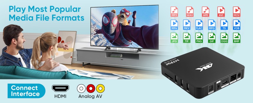 MYPIN Lecteur Multimédia 4K - HD Media Player TV HDMI - Accepte HDD de 8TB/Clé USB 256G/Carte SD - Sortie HDMI/AV - MKV, AVI, MP4, H.265.