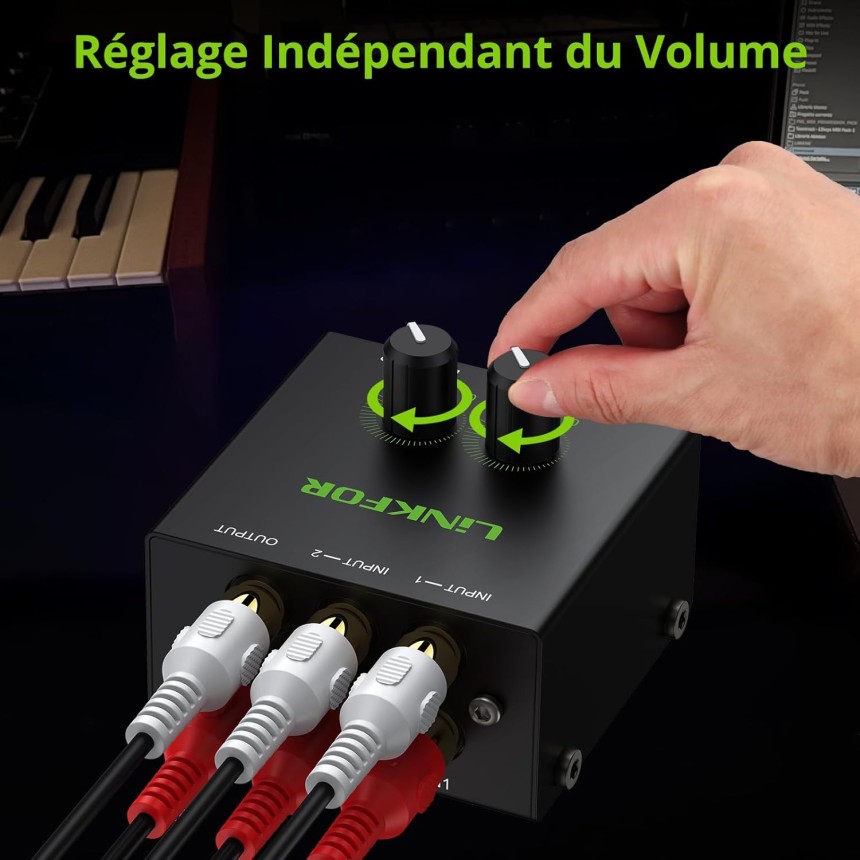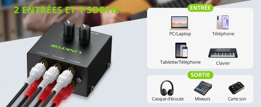 - ▶️ Contrôle du Volume Précis et Indépendant : Deux potentiomètres de gain indépendants permettent d’ajuster avec précision le niveau de chaque source pour un équilibre audio parfait entre vos différents appareils