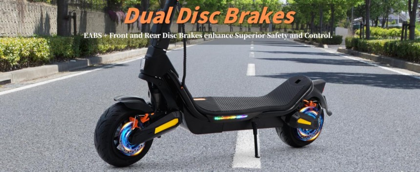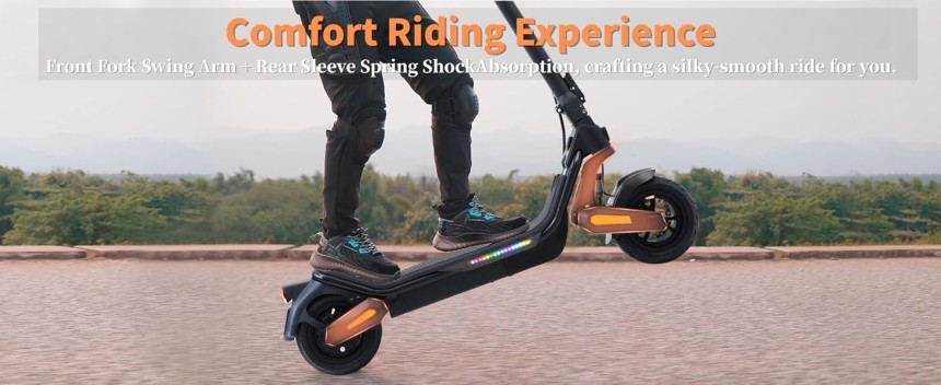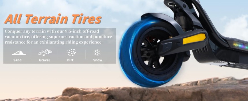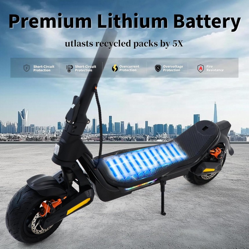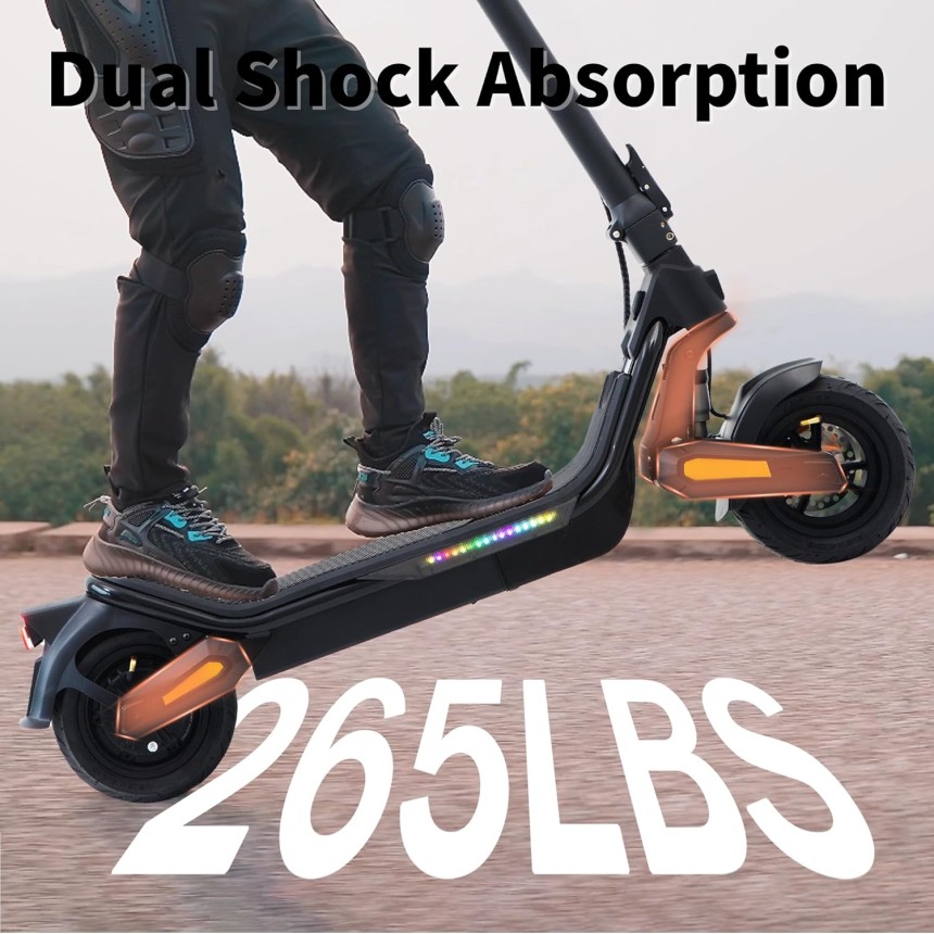 - ▶️ Performances Excellentes : La trottinette électrique est équipée d'un système de freinage à disque hydraulique qui donne une réponse rapide des freins et une conduite plus sûre. D'excellents suspension à double ressort à l'avant et à l'arrièreence offrent un confort de conduite maximal. Pneus tout-terrain de 9.5 pouces, excellente résistance à l'abrasion, anti-crevaison, le modèle fournit une excellente adhérence, de sorte que vous pouvez rouler en douceur et librement sur toutes sortes de surfaces routières.