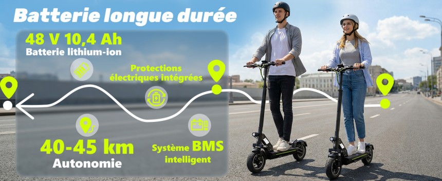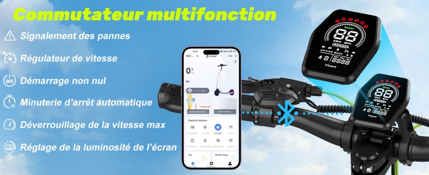 - ▶️ Longue autonomie et application intelligente : Conçue pour les trajets quotidiens, la trotinette électrique D5 est équipée d'une batterie lithium-ion 48 V 10,4 Ah offrant une autonomie d'environ 45 à 50 kilomètres par charge, idéale pour les déplacements urbains. Son écran LED intelligent affiche clairement le niveau de batterie, la vitesse et le kilométrage, et propose des réglages pratiques comme le régulateur de vitesse, le réglage de la luminosité et l'arrêt automatique. Grâce à l'application Bluetooth, la D5 se connecte facilement à votre smartphone pour consulter vos données de conduite et effectuer des réglages de base, pour des déplacements plus simples et intuitifs.