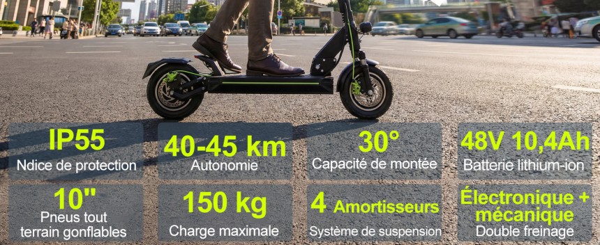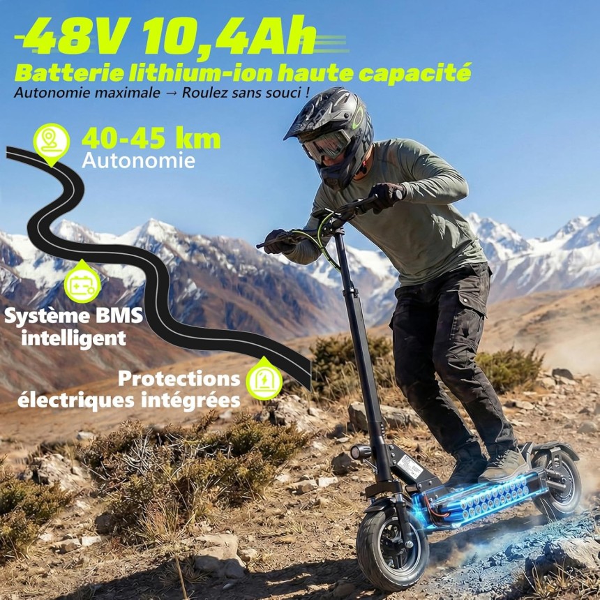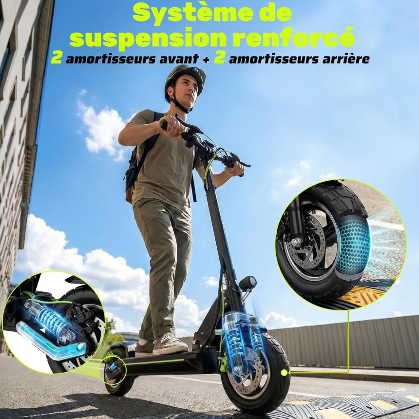 - ▶️ Trottinette electrique adulte tout terrain : Équipée de pneus gonflables tout-terrain de 10 pouces, cette trottinette électrique adultes s’adapte aussi bien aux routes asphaltées qu’aux chemins en terre ou irréguliers.Le système de freinage double (frein électronique + frein mécanique), les poignées et le deck antidérapants, ainsi que l’indice d’étanchéité IP55, garantissent une conduite sûre.Phare avant puissant, feu arrière clignotant et clignotants gauche/droite améliorent la visibilité nocturne. Les suspensions avant et arrière à double ressort assurent un excellent confort de conduite.