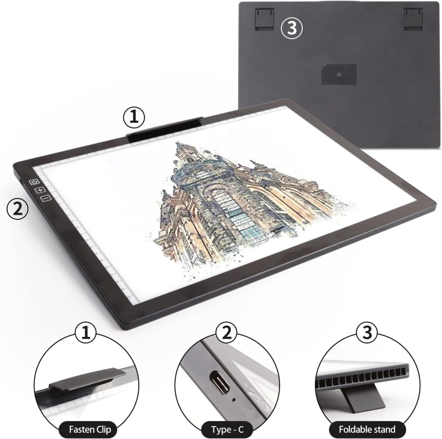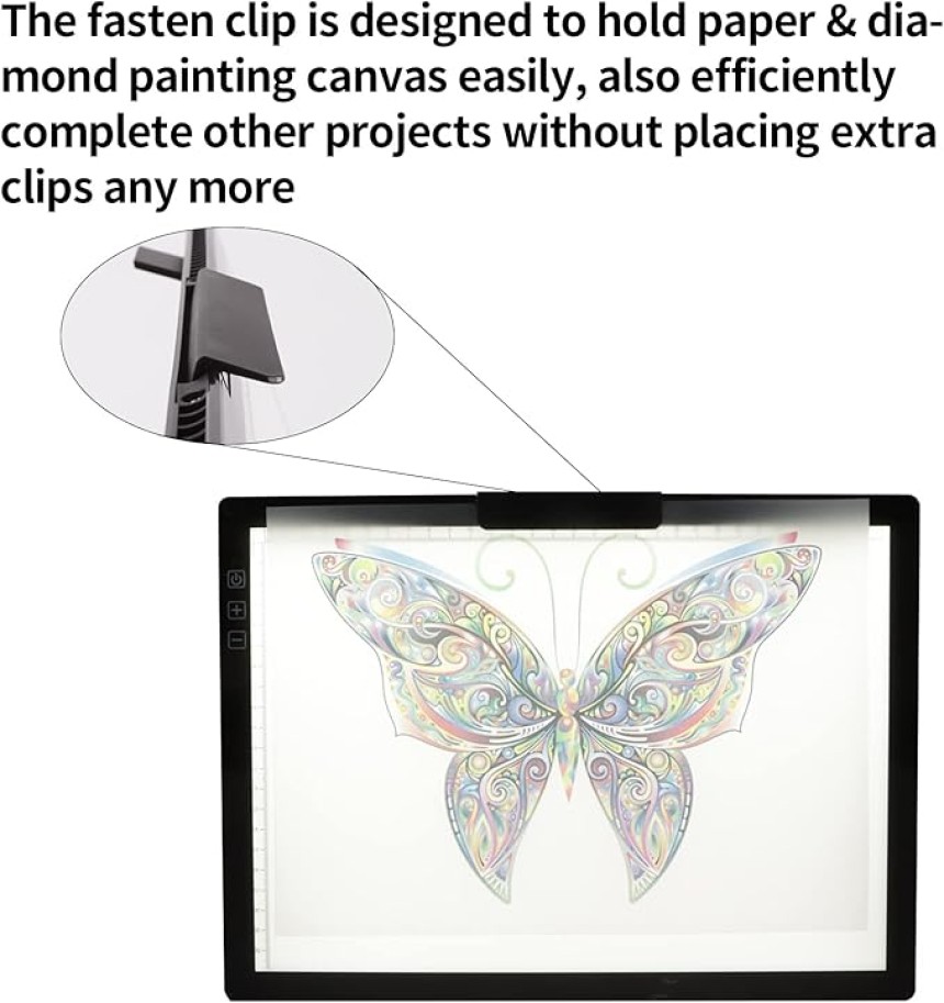 - ▶️ Support innovant et clip supérieur stable : La face arrière de la table lumineuse A4 est livrée avec une fonction de support INNOVANTE qui vous permet également d'ajuster l'angle du tableau à copier à tout moment et n'importe où. Le bloc de traçage ultra fin le rend portable, le clip supérieur de fixation est conçu pour contenir facilement du papier et de la toile de peinture diamant, ainsi que pour réaliser efficacement d'autres projets sans placer de clips supplémentaires.