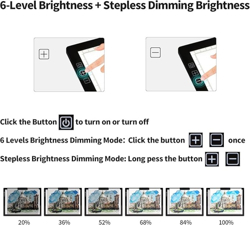 - ▶️ 6 niveaux de luminosité Mode de gradation:Cliquez une fois sur le bouton (+/-) pour régler l'éclairage de la table en fonction de la lumière ambiante et de l'épaisseur/du poids du papier pour l'adapter à vos projets.