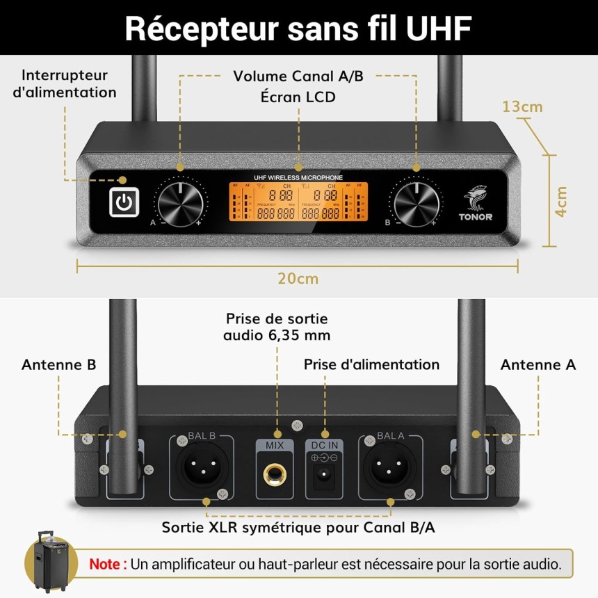 - ▶️ Facile à utiliser : une fois l'appareil connecté et démarré correctement, le microphone et le récepteur s'accordent automatiquement. Aucune autre étape n'est nécessaire. Le microphone sans fil TONOR offre un son exceptionnel à partir d'un système sans fil fiable. Pour le fonctionnement, 4 piles AA sont nécessaires qui ne sont pas incluses dans la livraison et peuvent normalement être utilisées pendant 12 heures. (Remarque : il est recommandé de préparer des piles tampon pour des événements importants)
