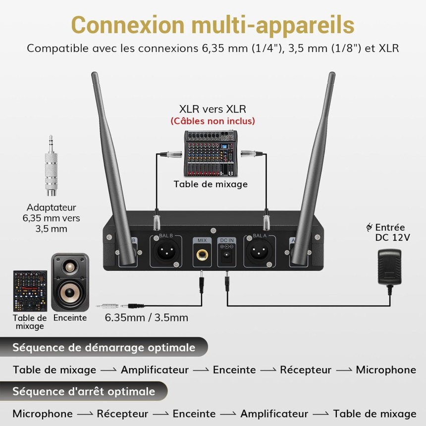 - ▶️ Qualité sonore claire et claire : avec une puce intégrée de haute qualité et une technologie d'enregistrement numérique avancée qui assure une reproduction sonore élevée et la qualité sonore est plus claire, plus pure et plus complète. La ligne LNA intégrée garantit moins de bruit de fond et de rétroaction. Parfait pour le karaoké, la fête, la performance, les activités religieuses, les réunions de famille, les mariages, les conférences, etc.